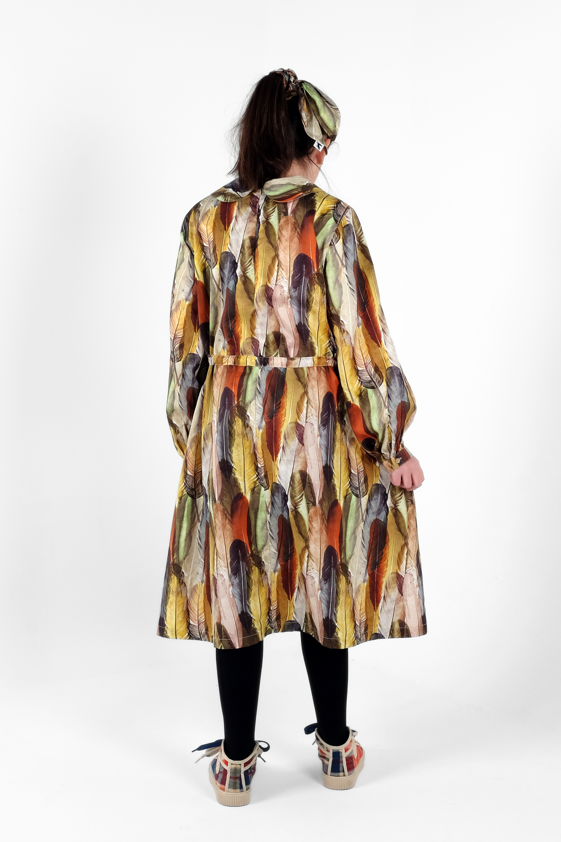 Long sleeved dress with waist adjustable straps, round collar and back zipper