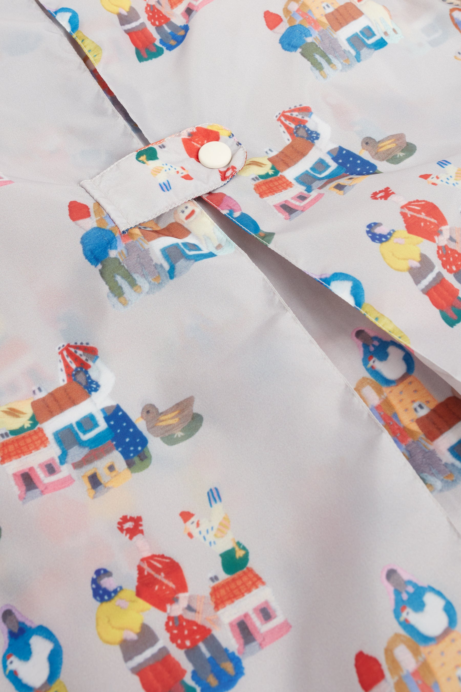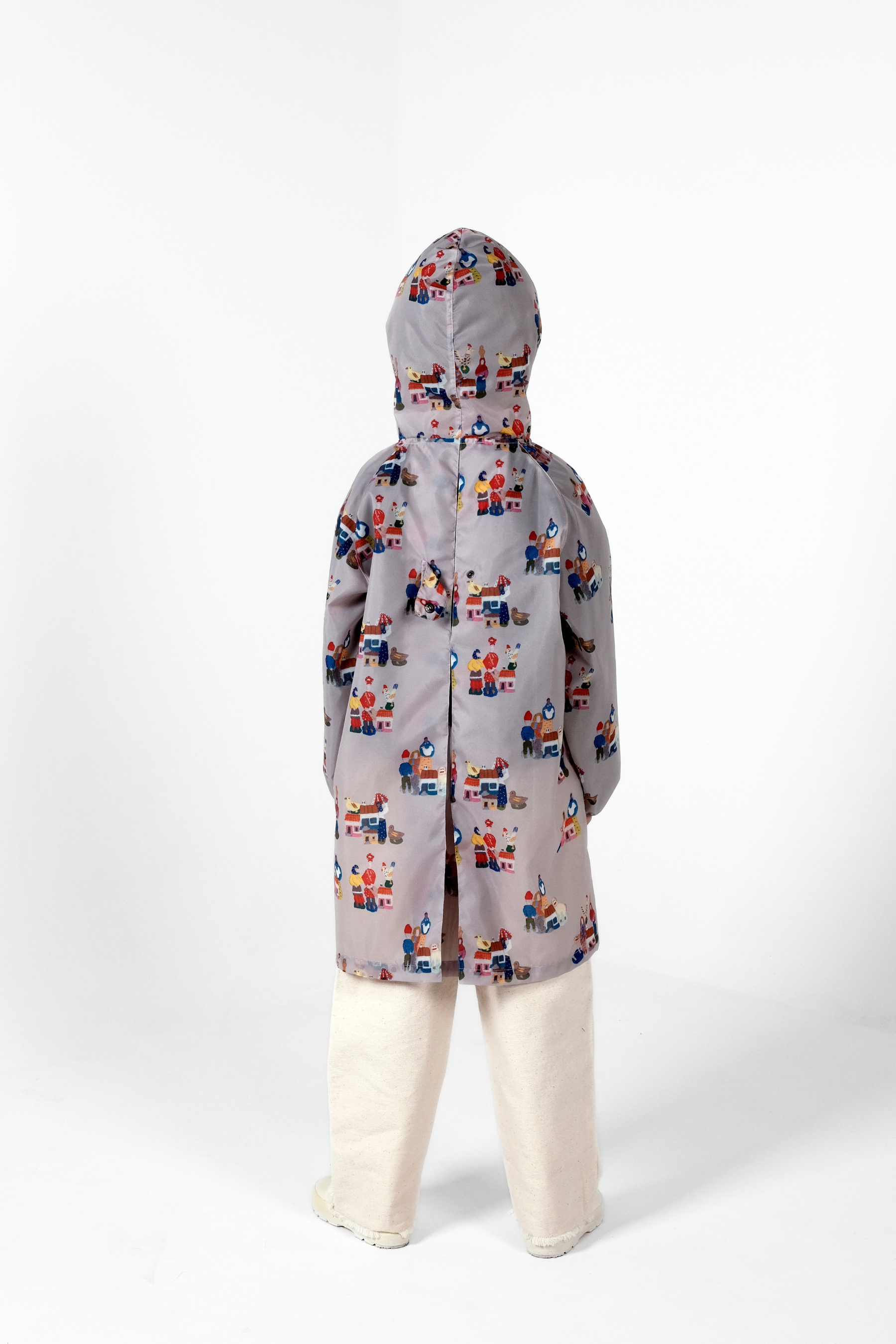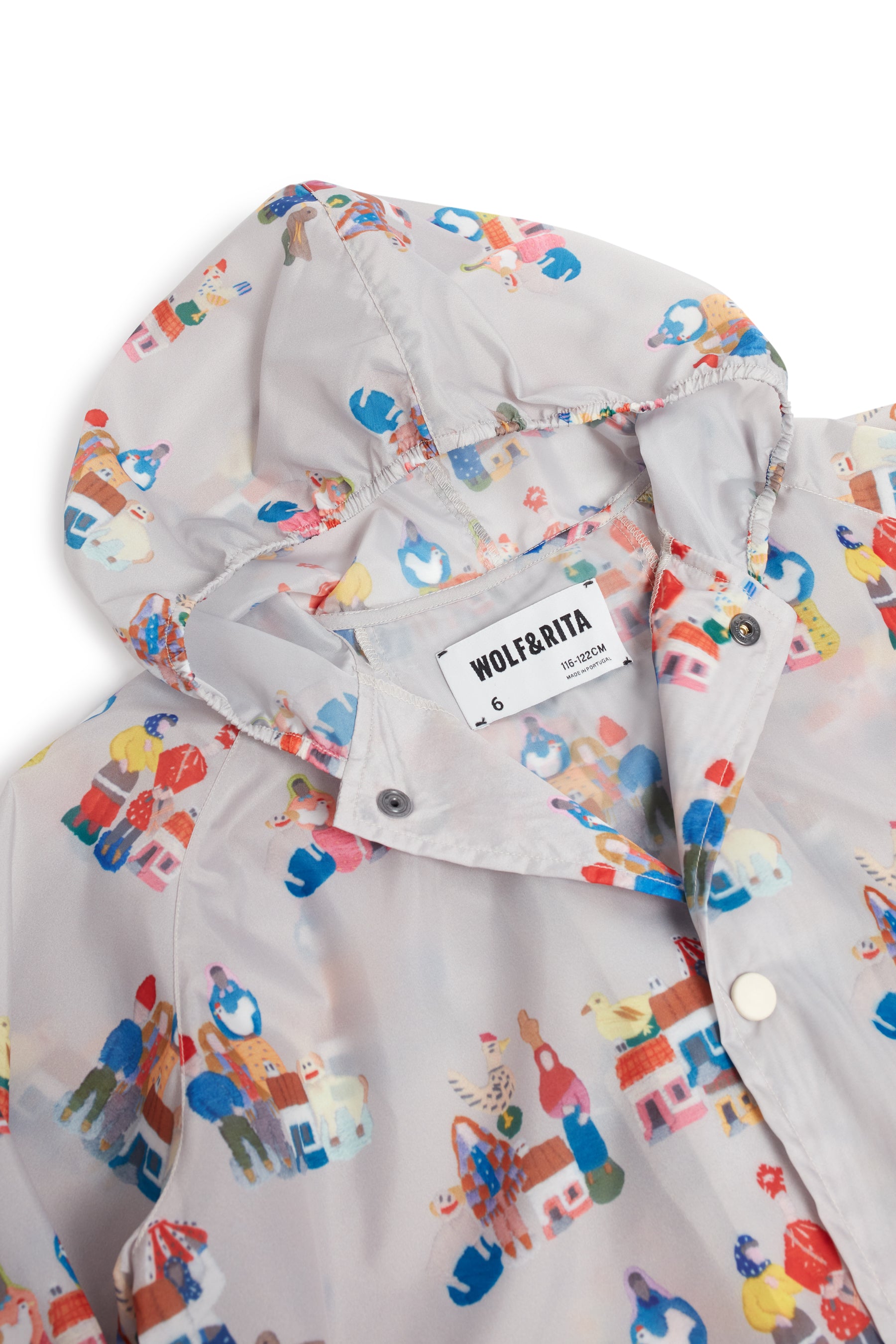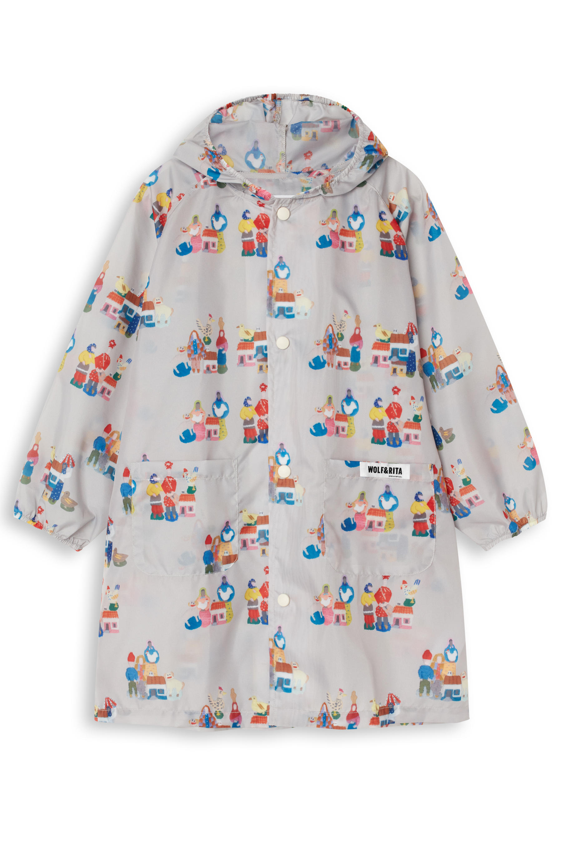 Long sleeved rainproof outerjacket, loose fit, with hoodie, pockets, and elasticated cuffs