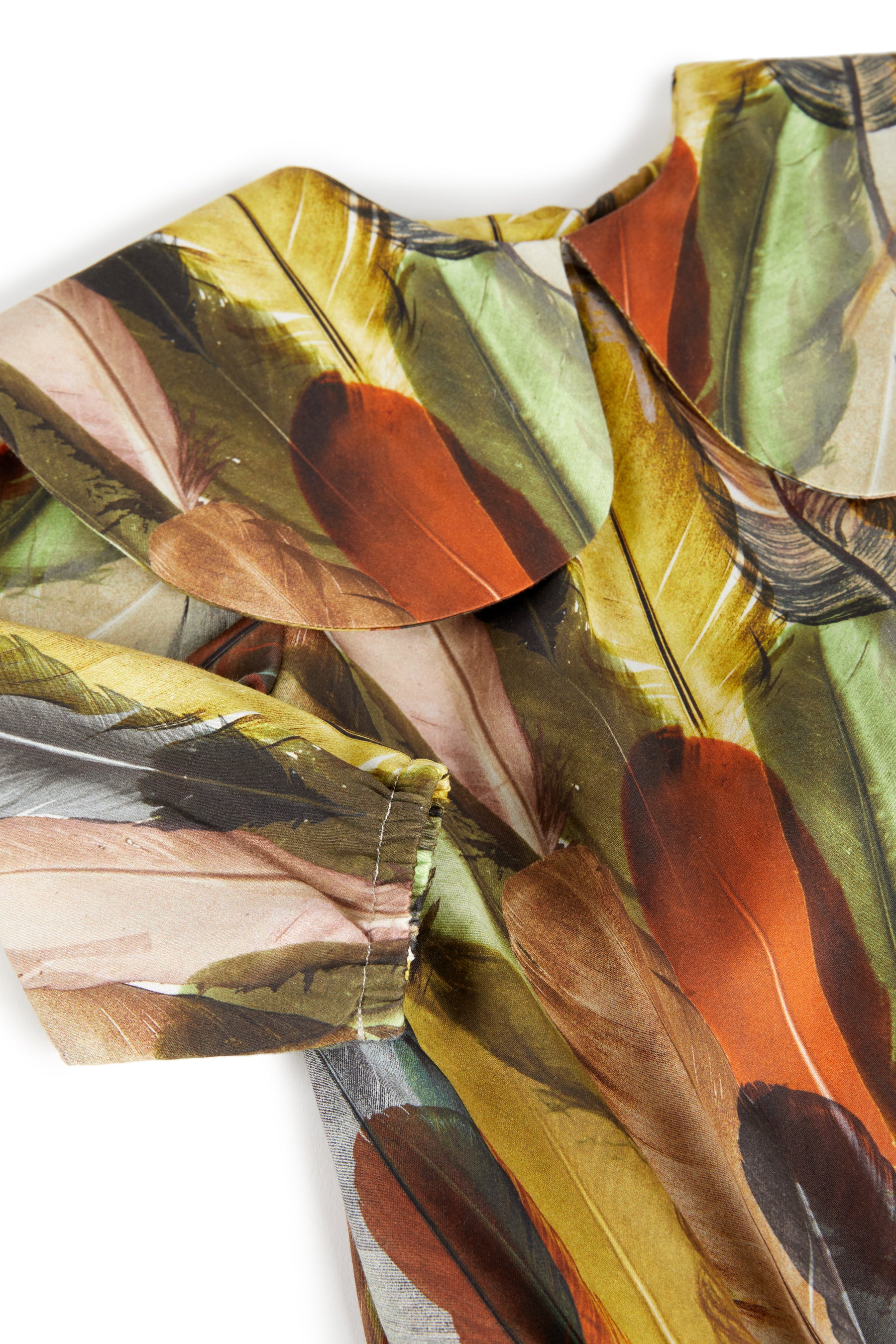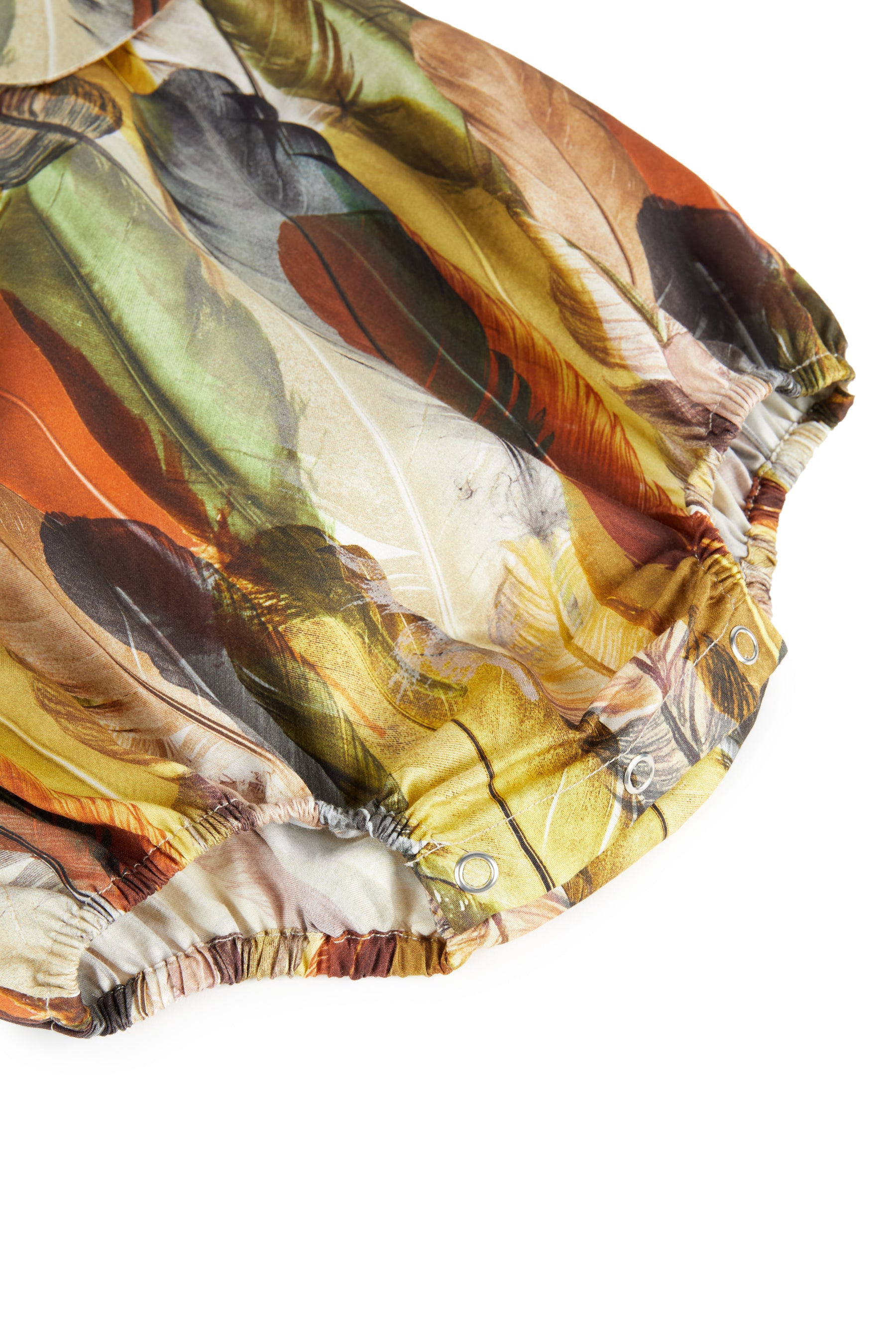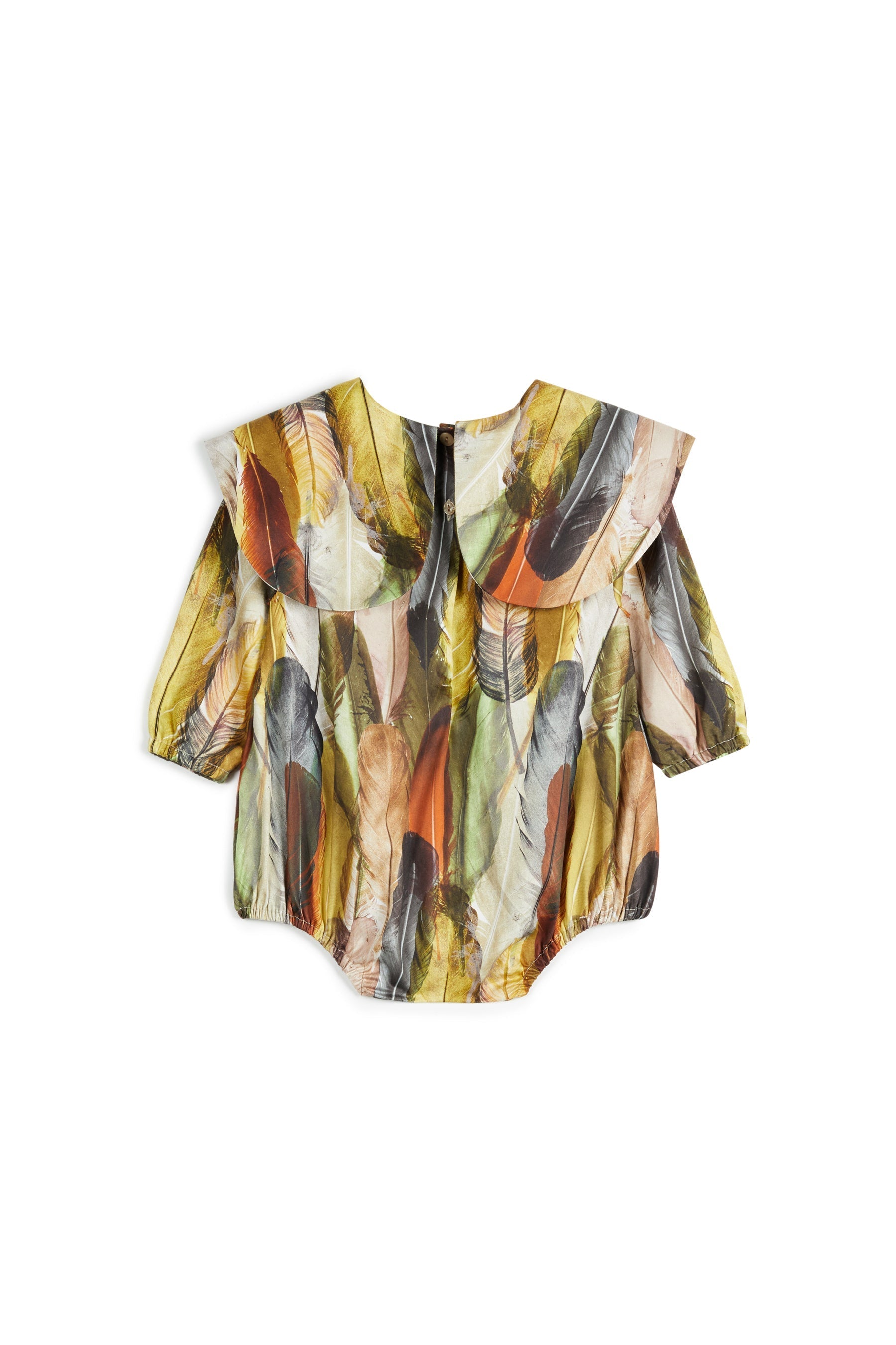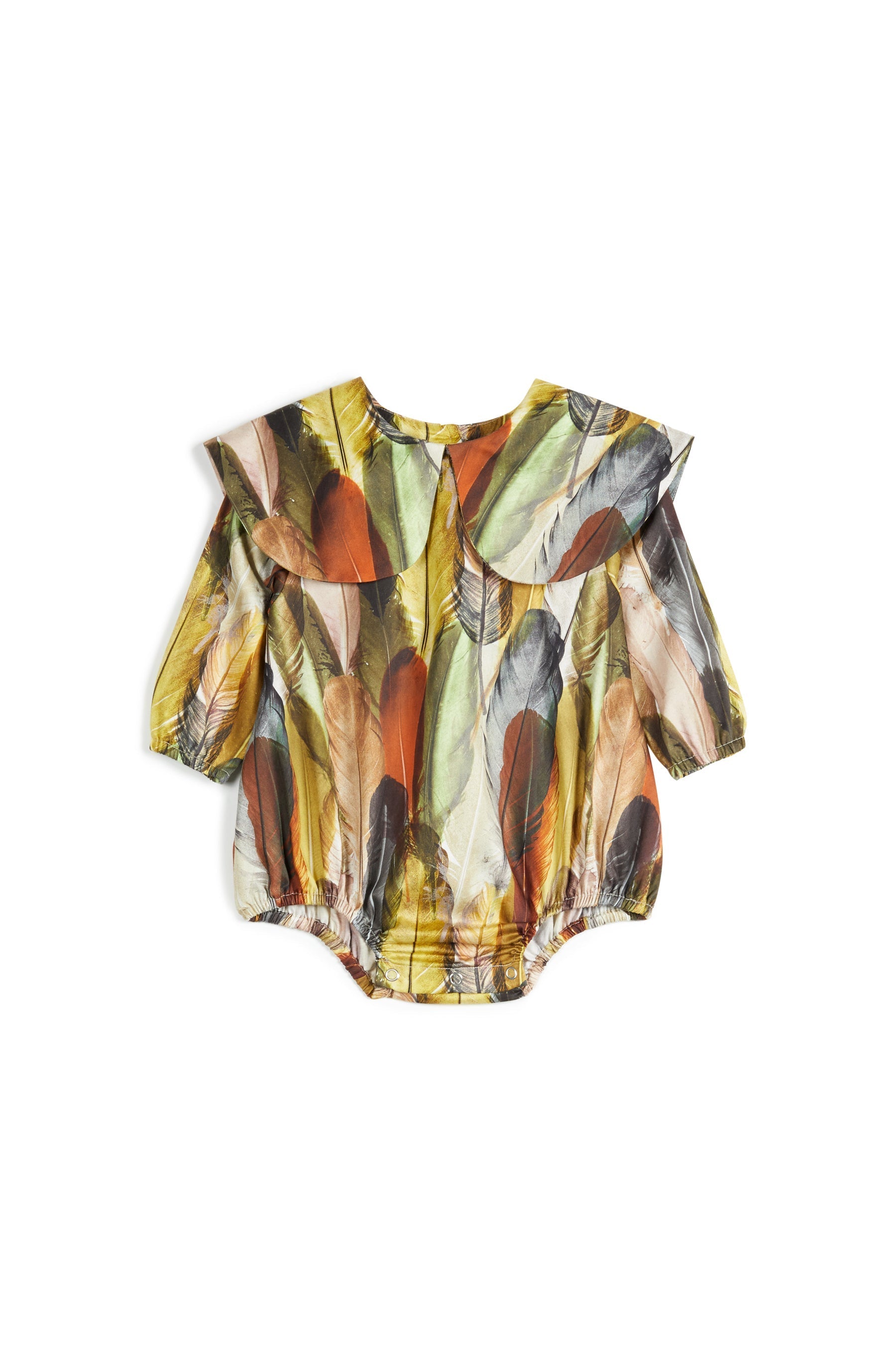 Long sleeved romper with round collar, back buttons, snap buttons between the legs and elasticated cuffs