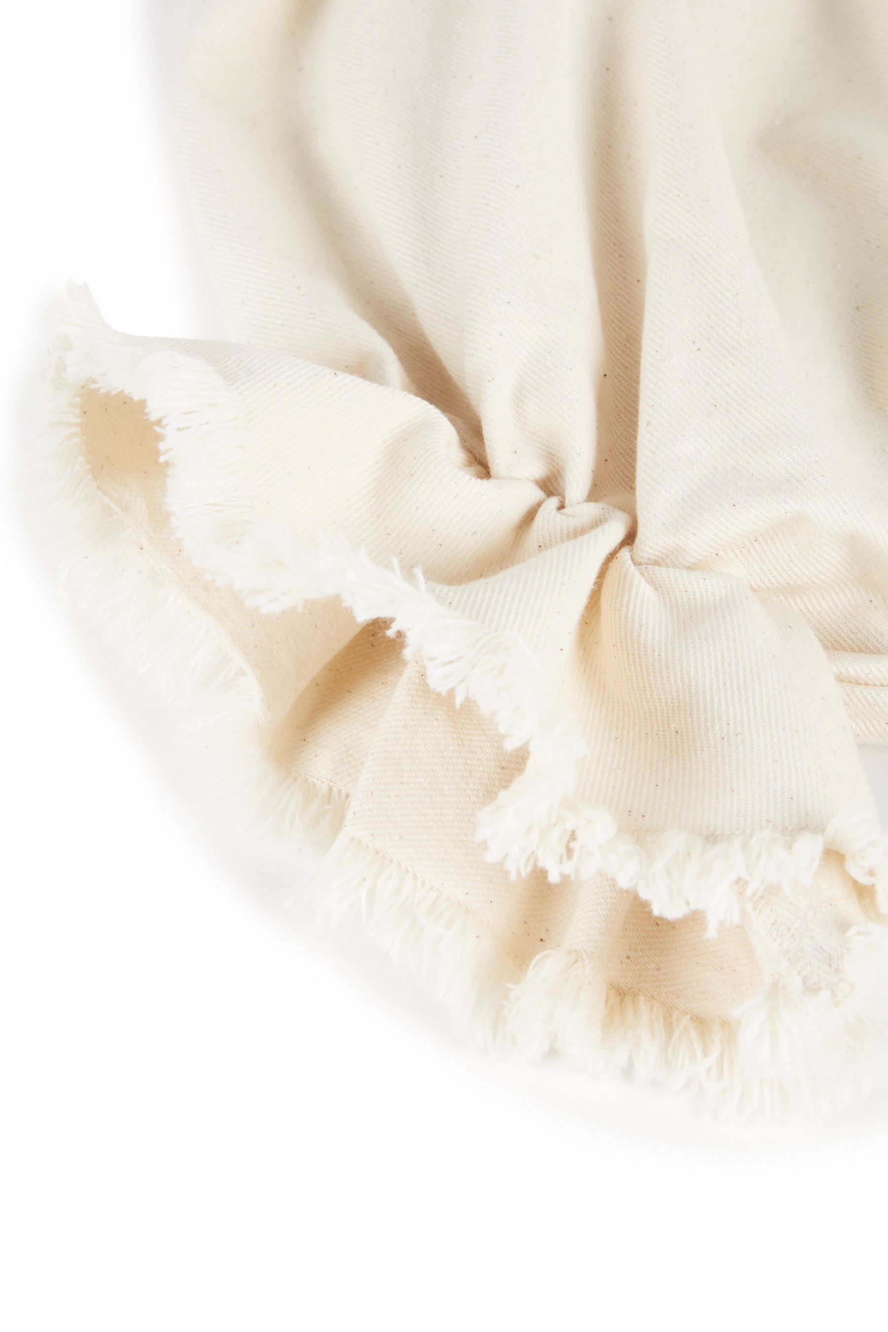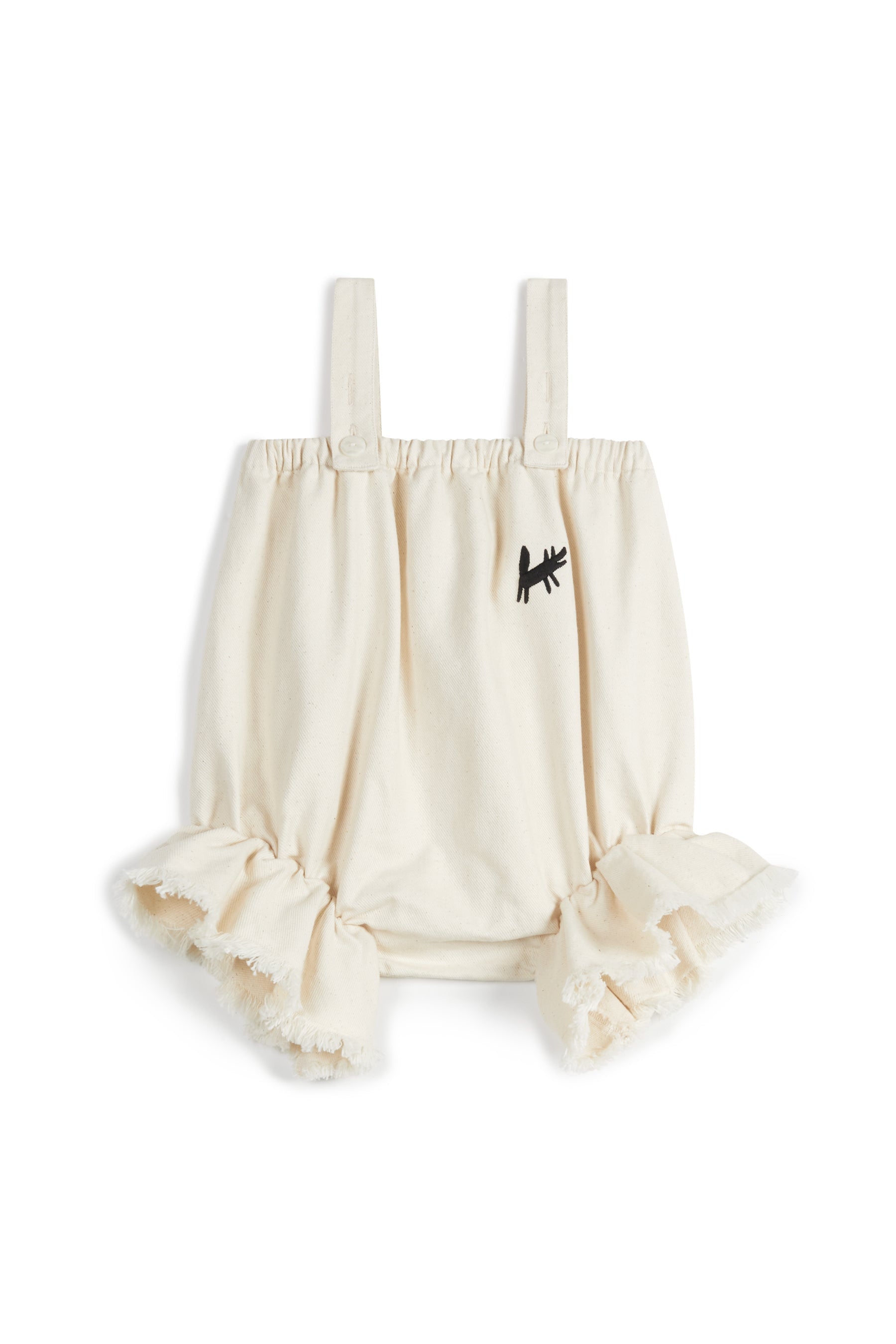 Sleeveless romper with adjustable straps, frill on legs with raw hems, snap buttons between the legs and small mascot embroidery