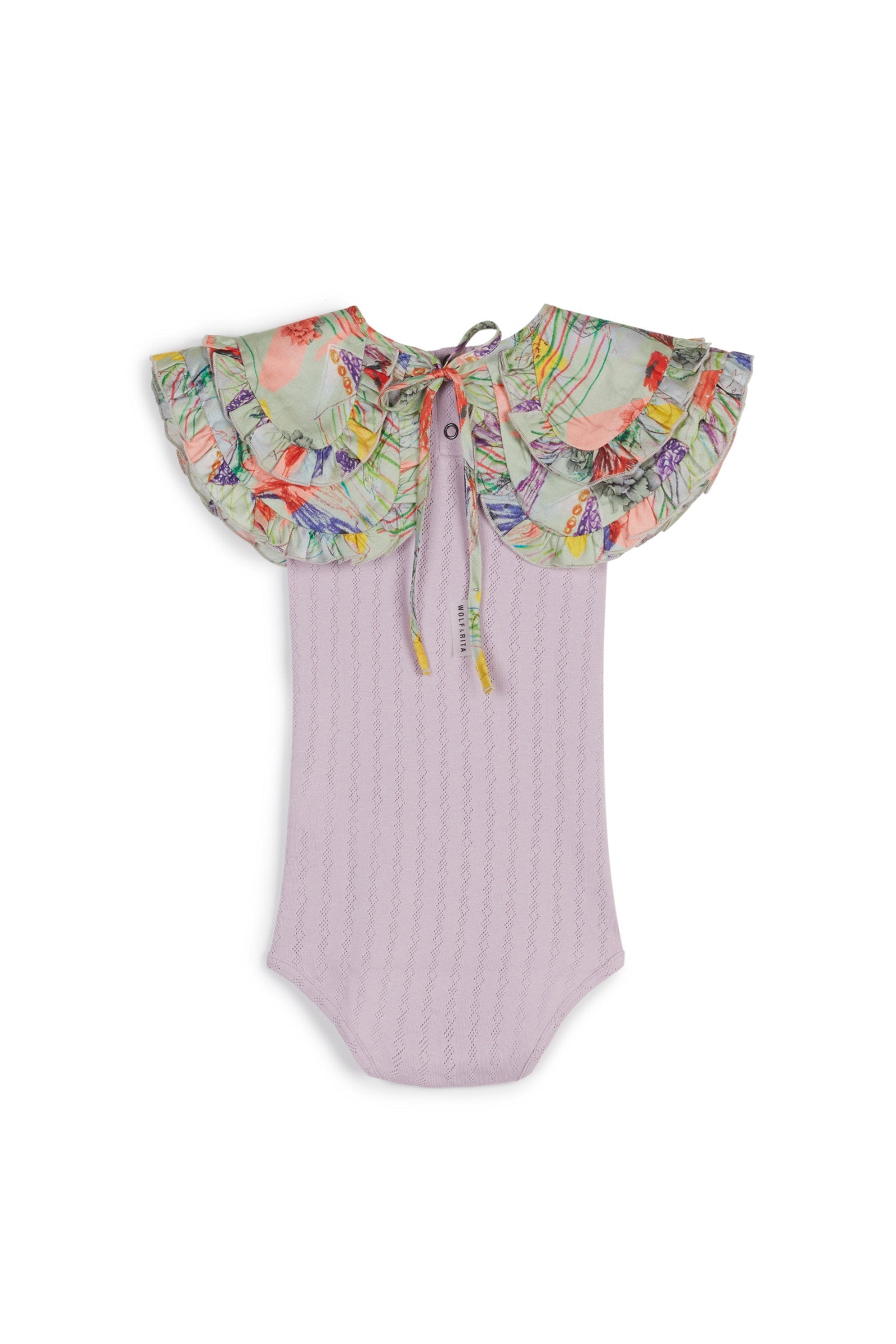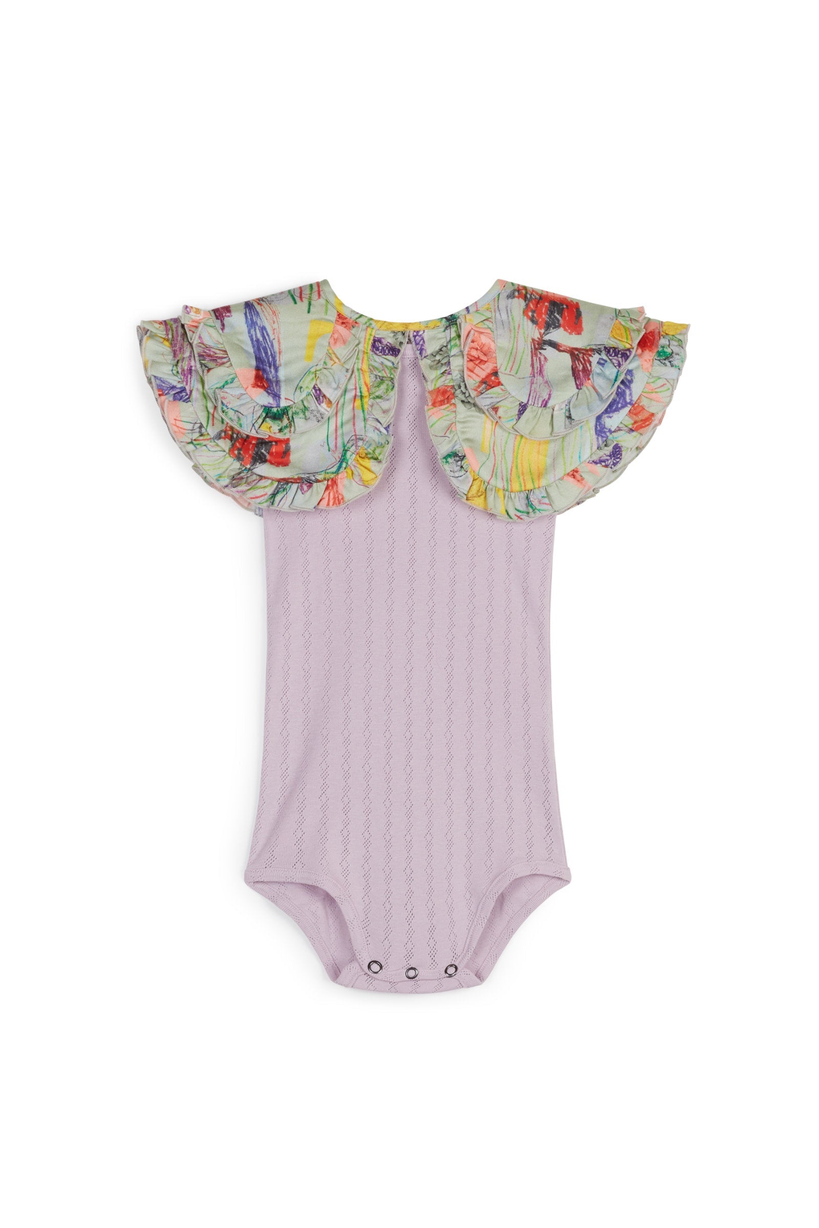 Garment dyed short sleeved bodysuit with snap buttons between the legs and on the back, and with contrasted removable collar