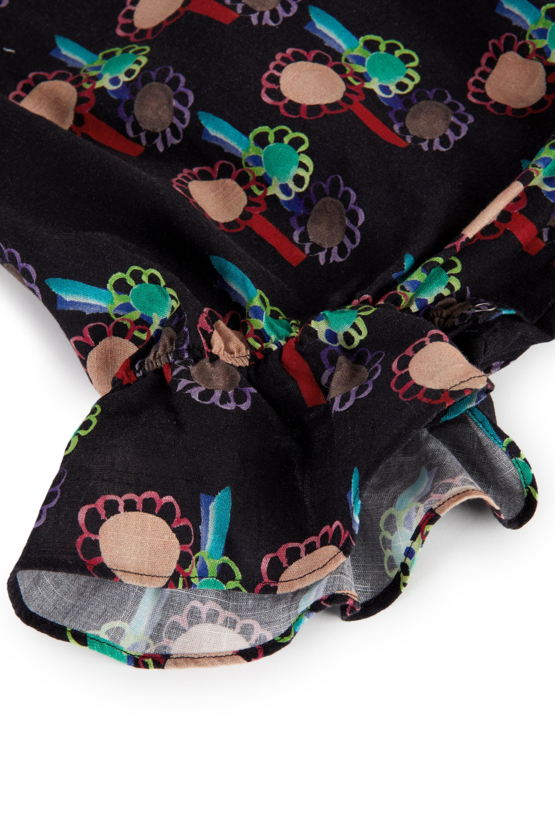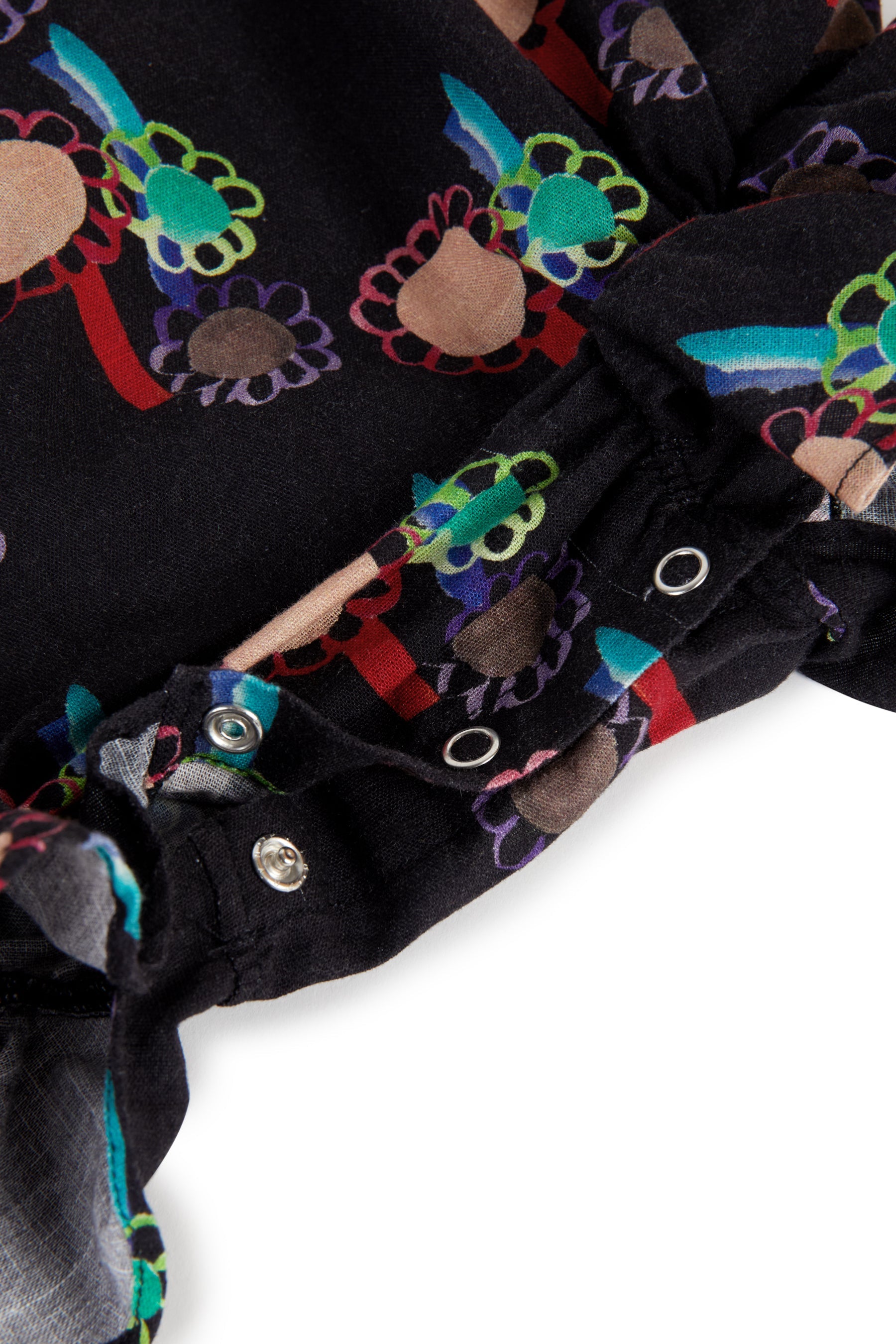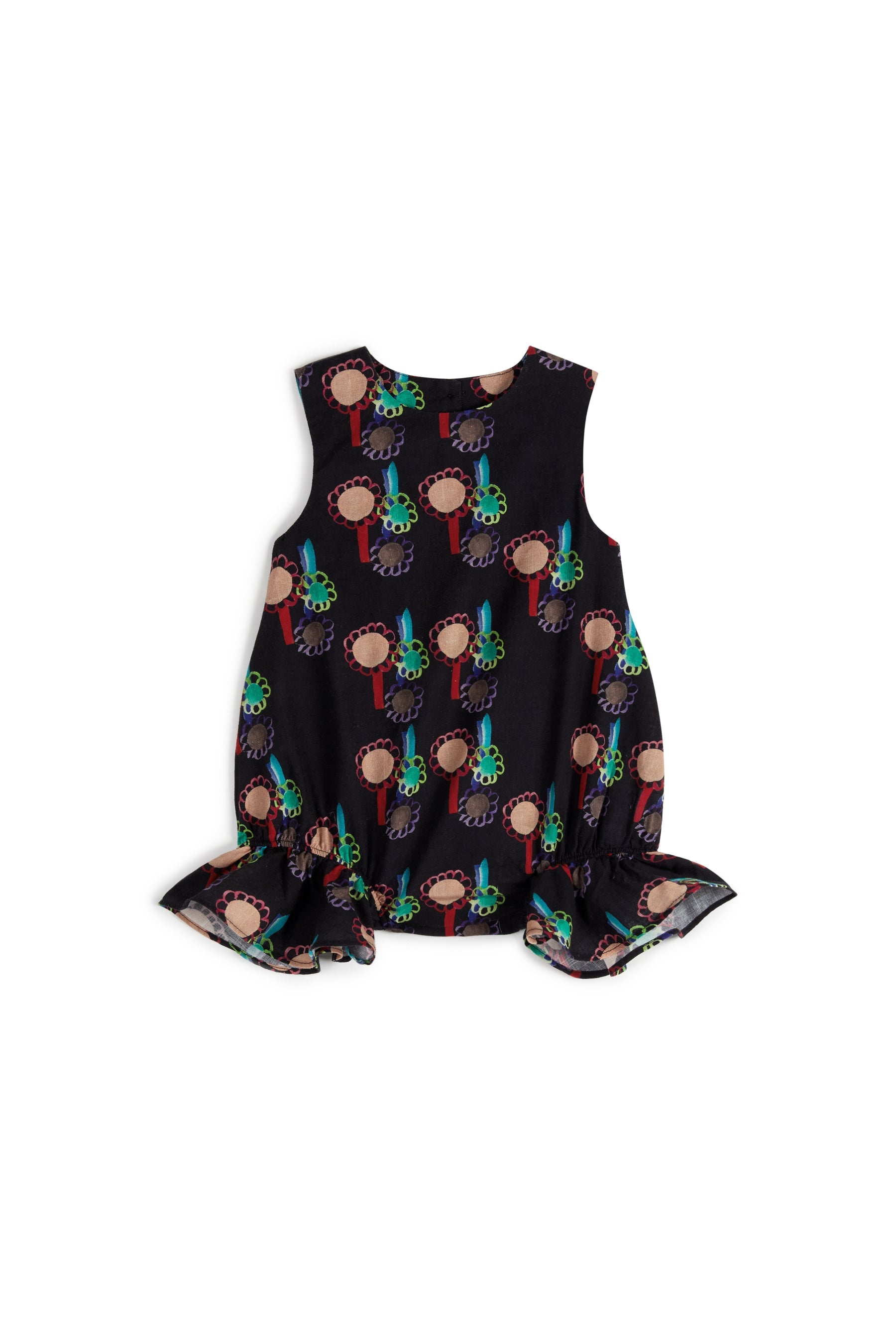 Sleeveless jumpsuit with frills on the legs, back button and snap buttons between the legs
