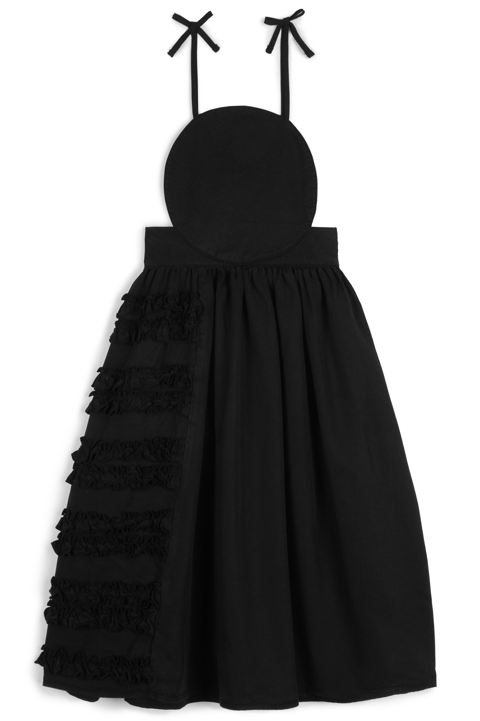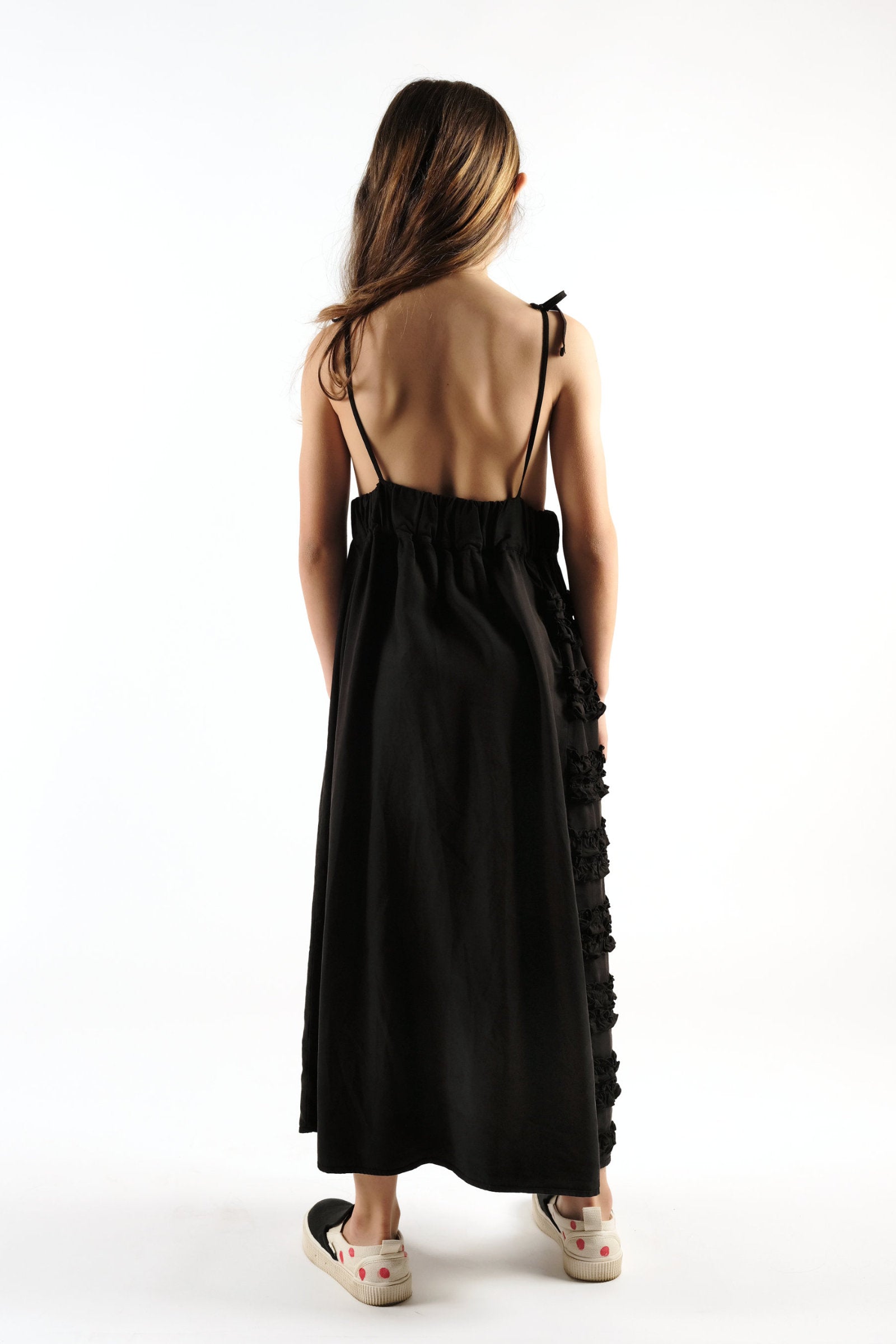 Garment dyed, long, sleeveless dress with open back and adjustable thin straps, elastic waist and frill details on skirt