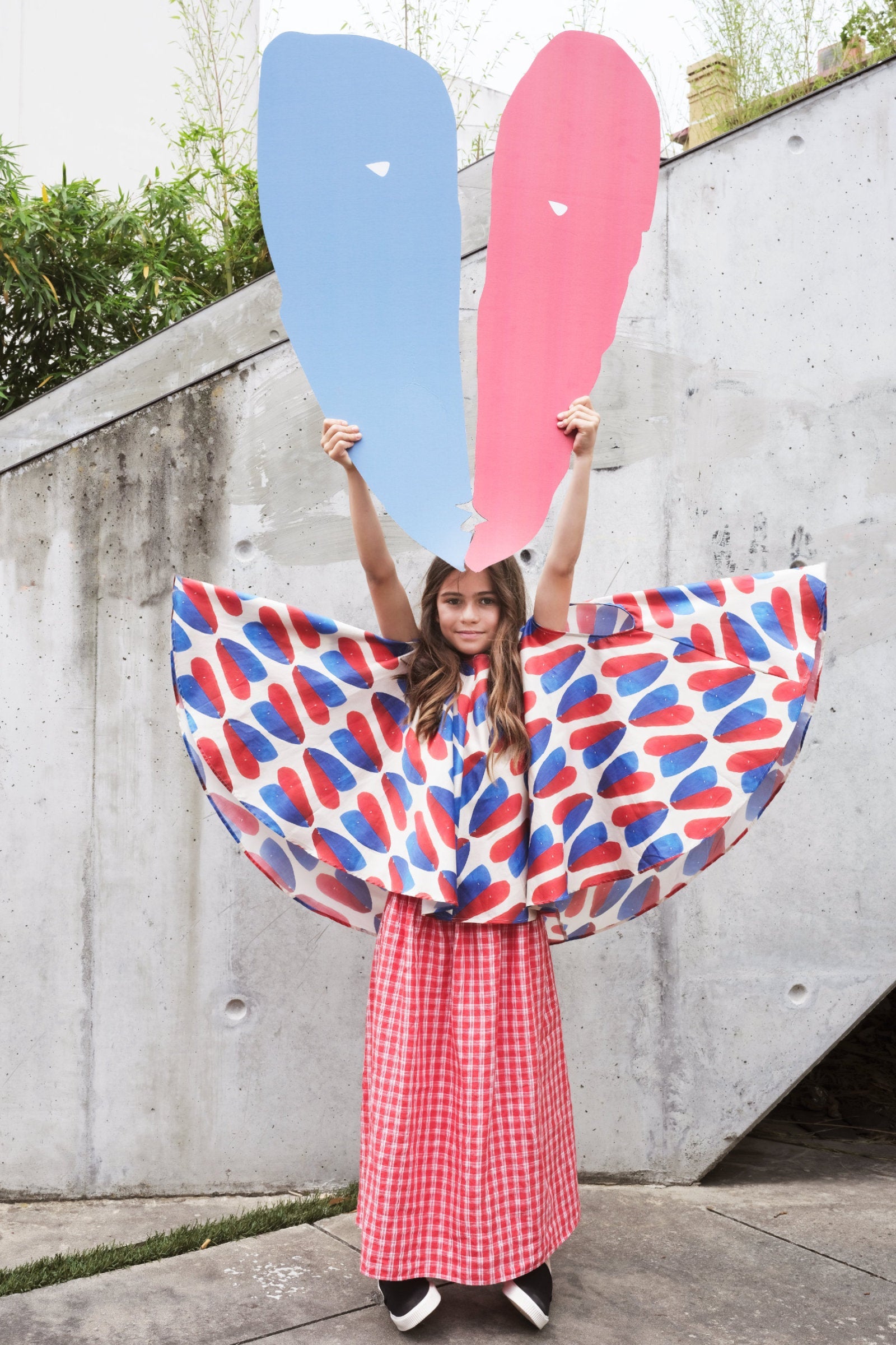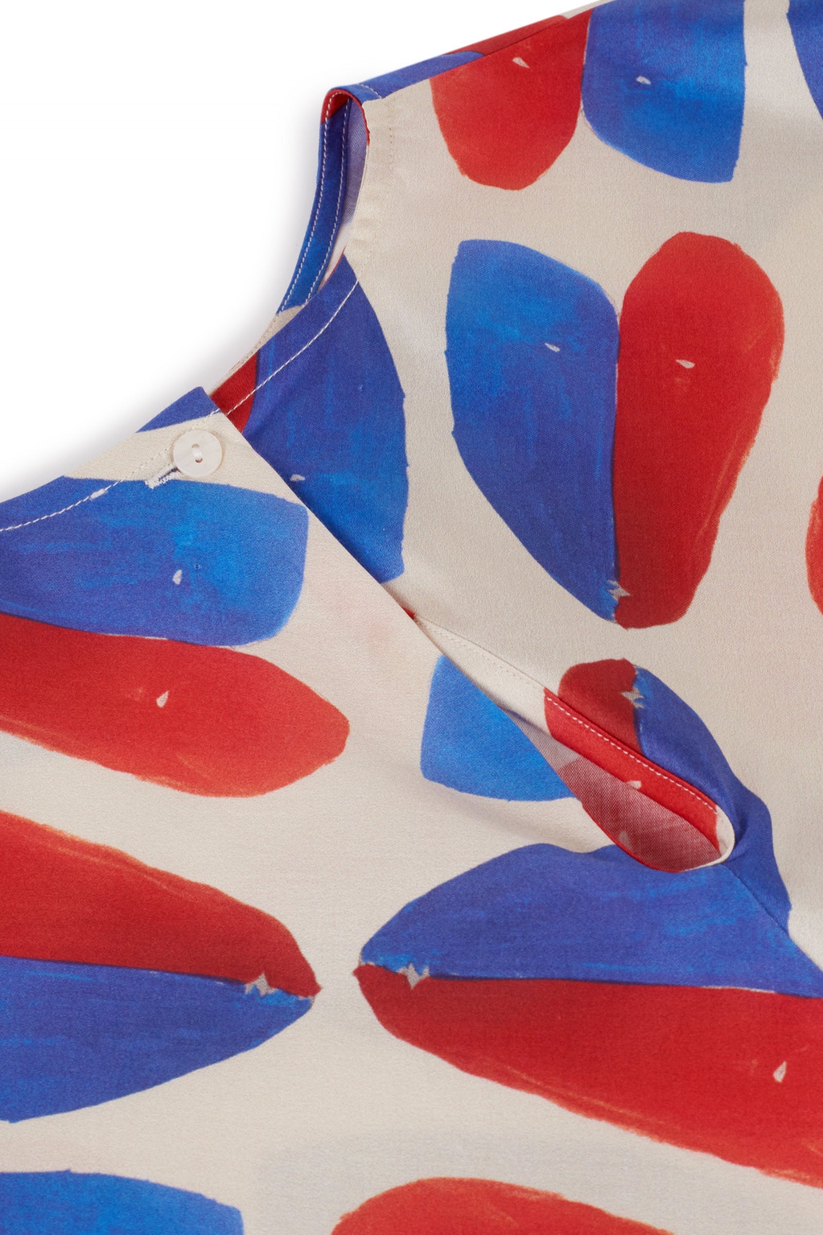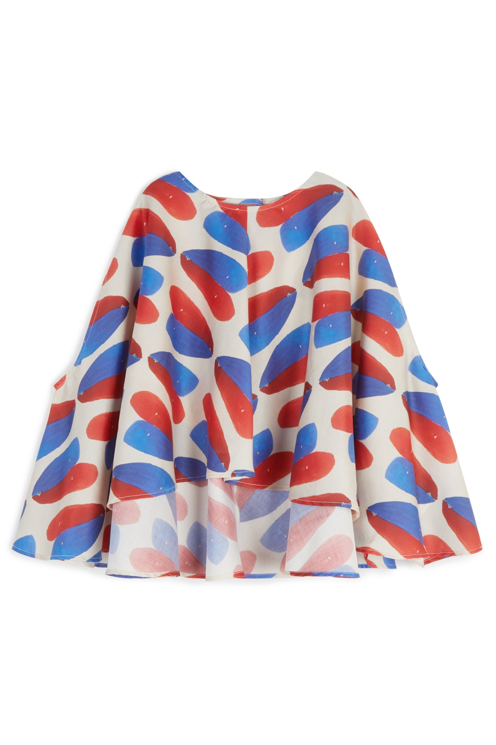 Sleeveless, voluminous cape-like blouse with longer back and back button and opening
