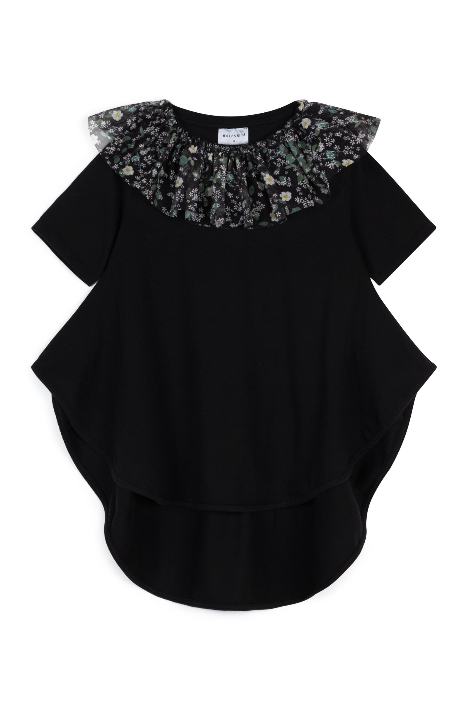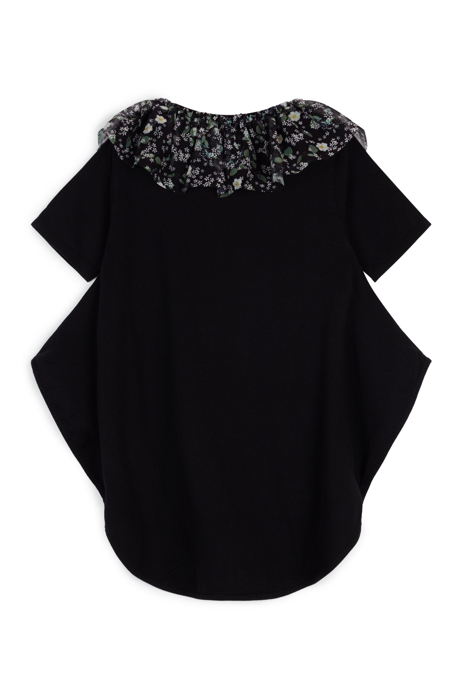 Garment dyed, short sleeved A-line voluminous tunic with tule frill on collar