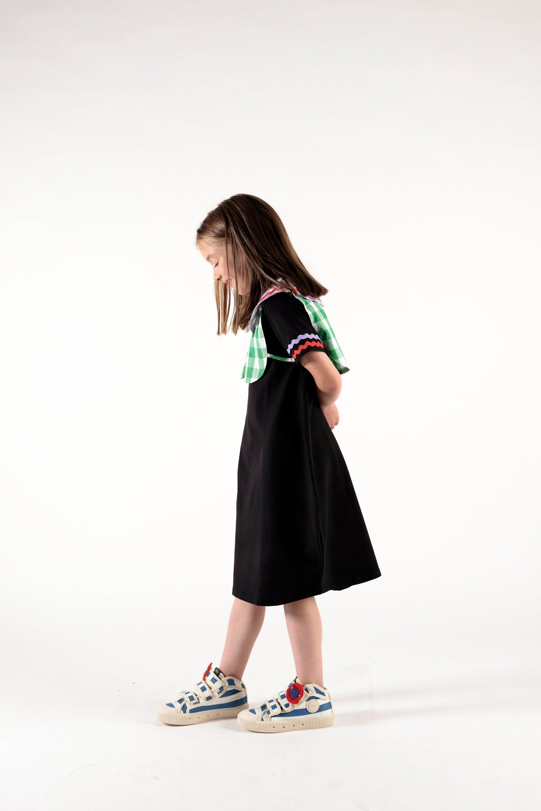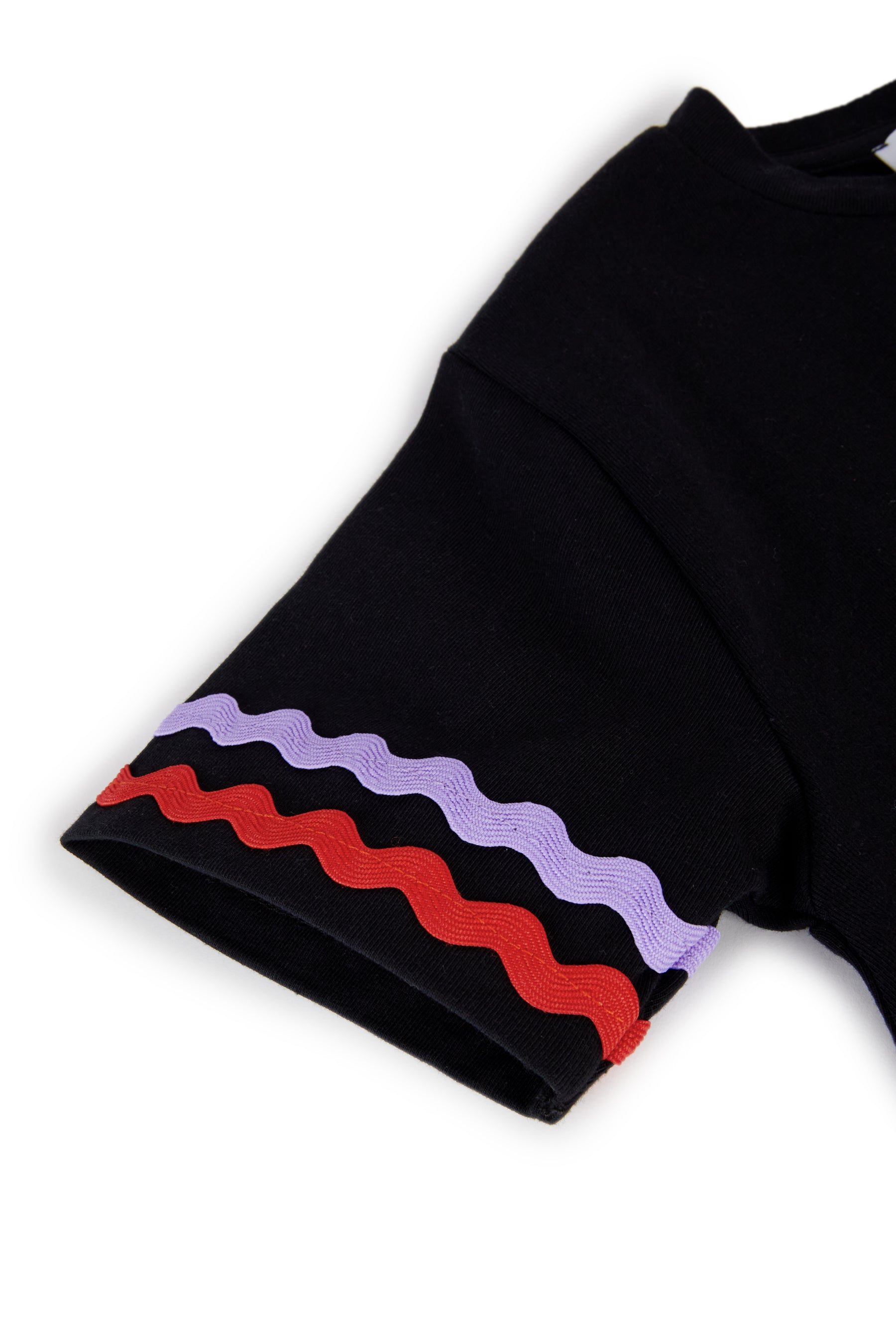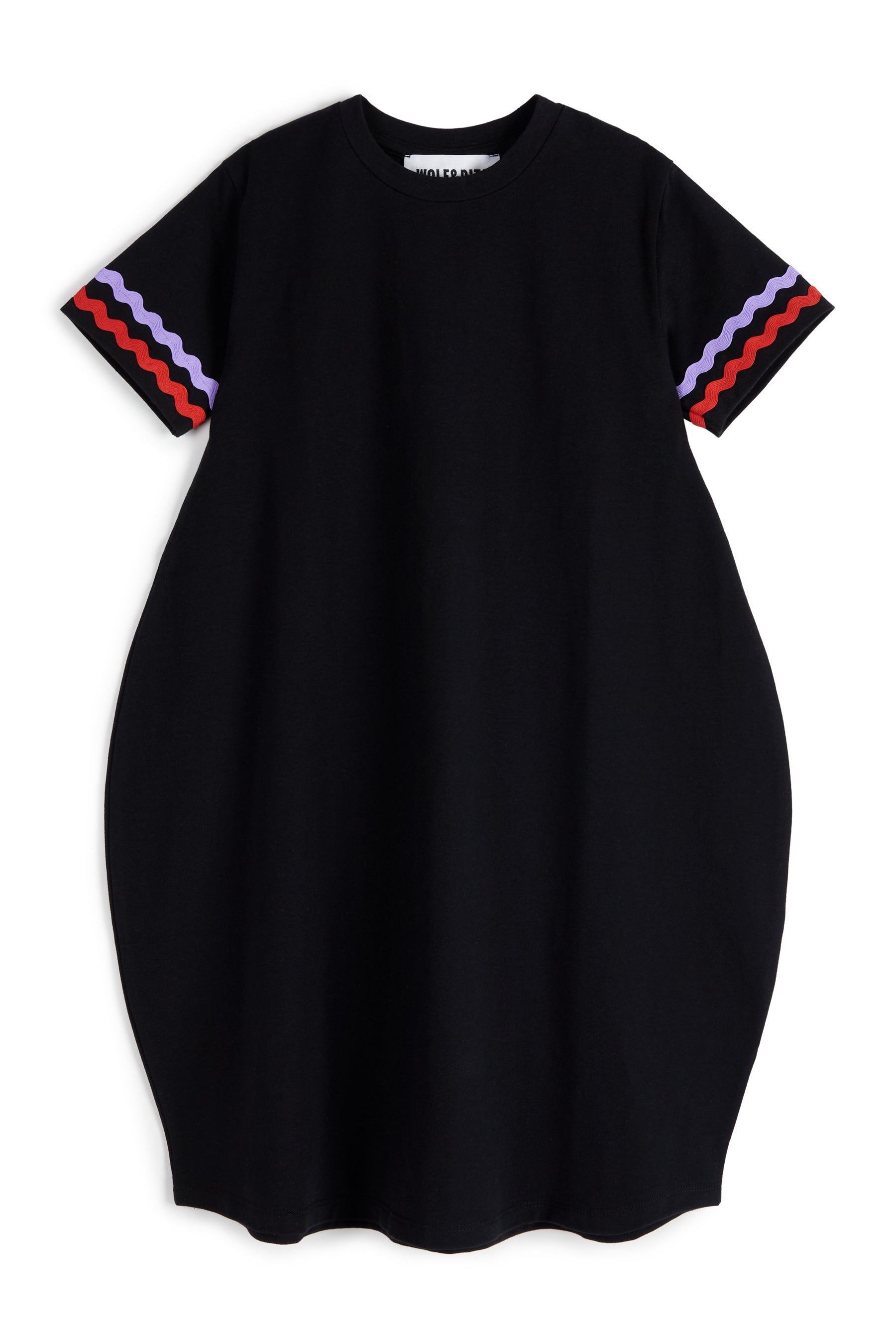 Short sleeved balloon dress with contrasted serpentine croquet detail