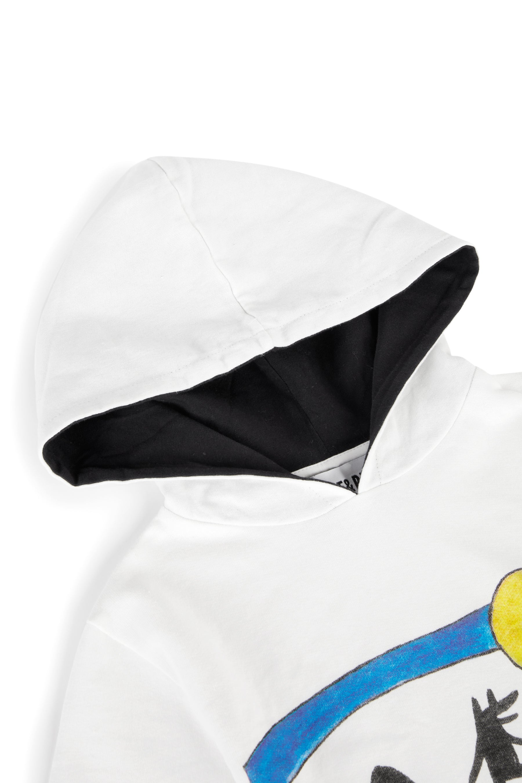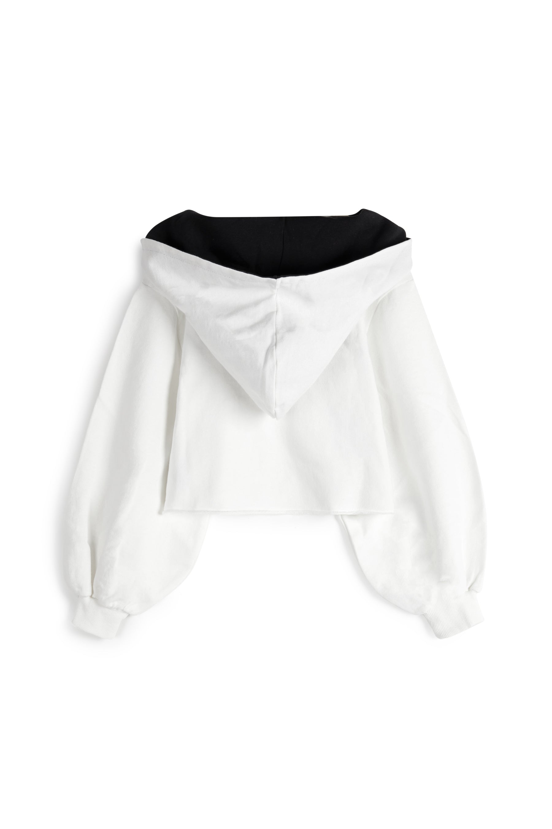 Cropped sweatshirt with long ballooned sleeves, hoodie (contrasted lining) and print