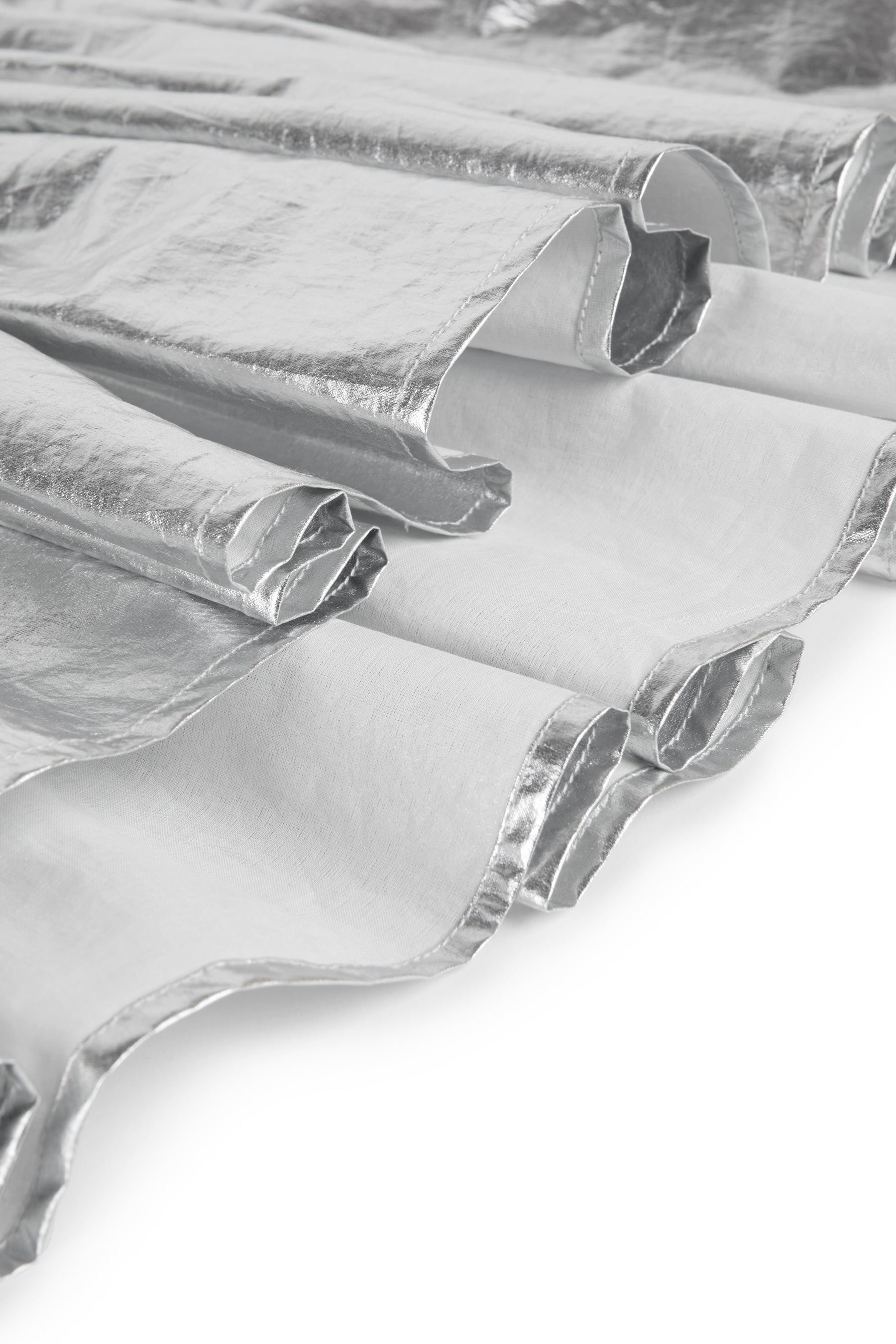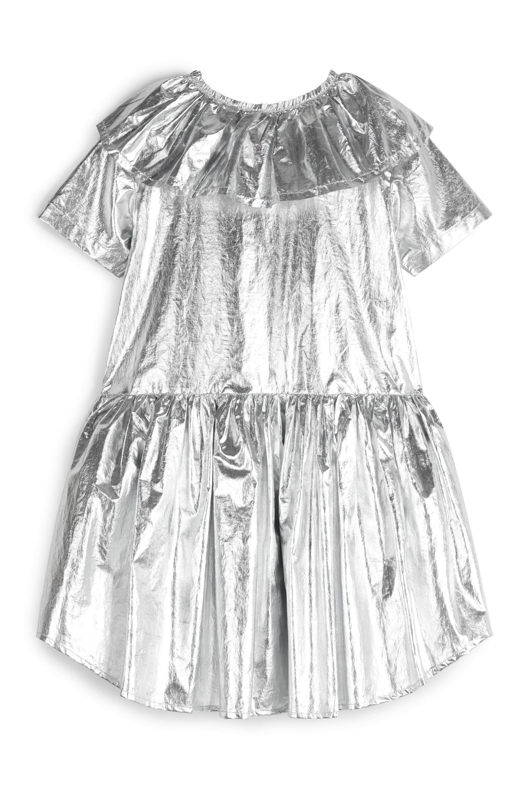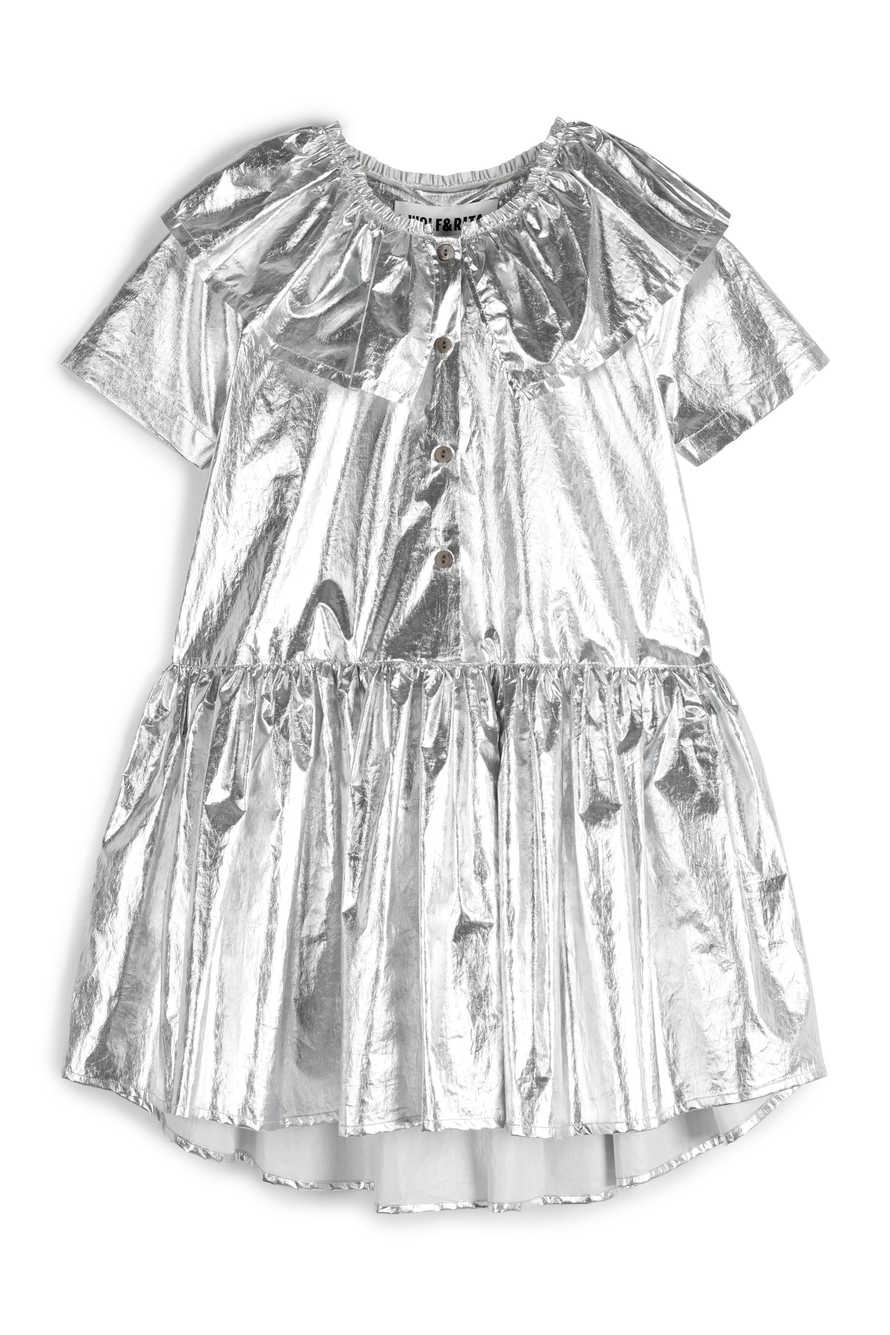 Shinny fabric short sleeved dress with asymmetric gathered skirt, front buttons and round collar