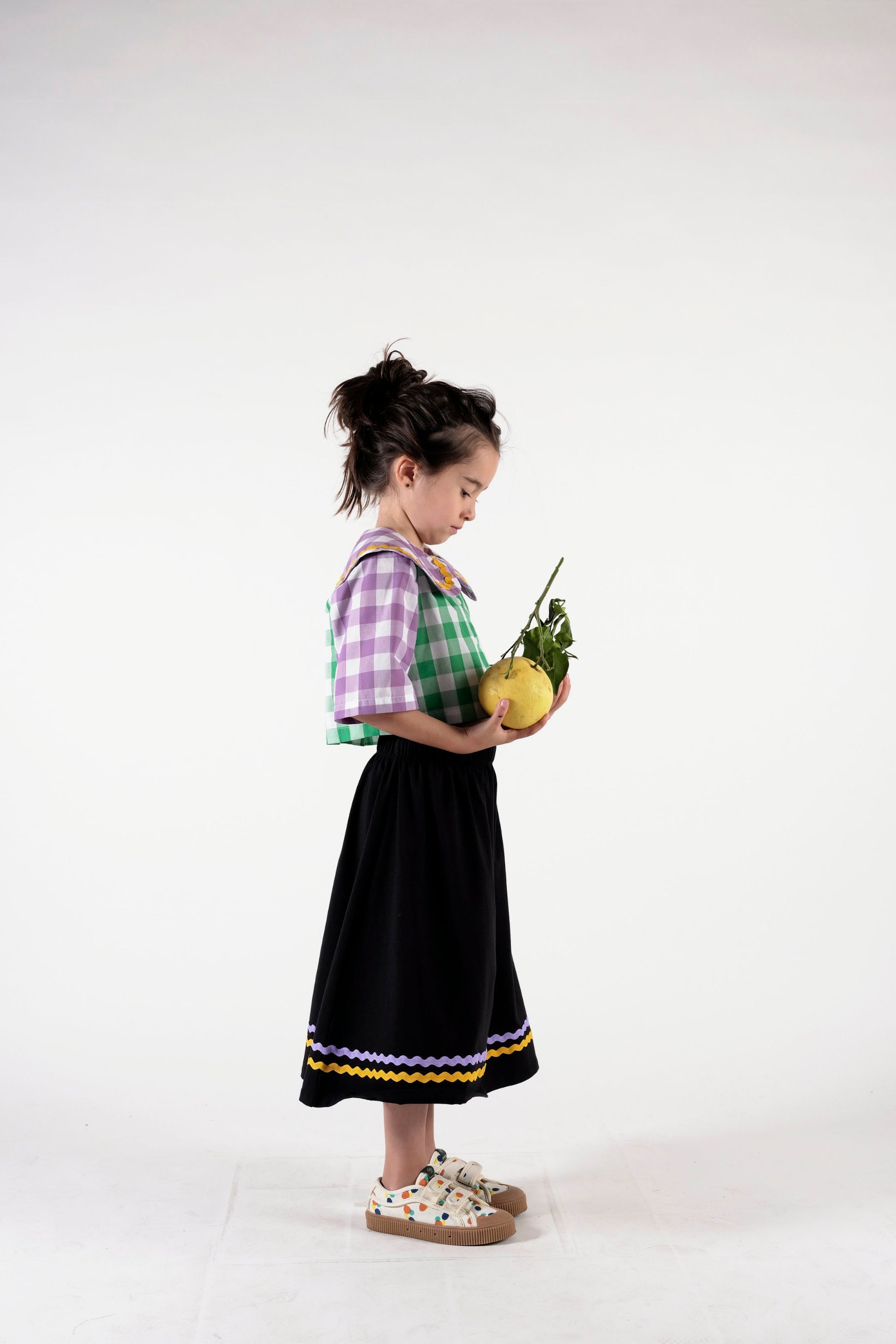 Mid length skirt with elasticated waist and contrasted serpentine croquet detail